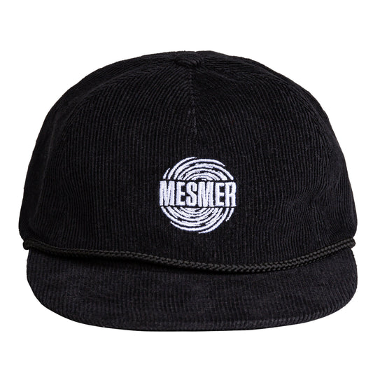 The Mesmer Spiral Cap is a five-panel hat crafted from organic cotton corduroy, featuring a classic design with an adjustable buckle, available in black and brown