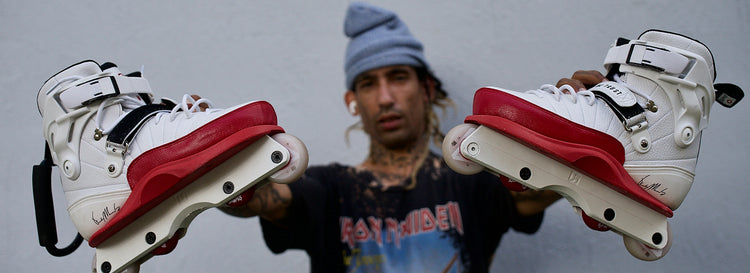 Gawds Michael Prado aggressive inline skates are sneaker look like flexible & responsive boots with fast souls supportive, cuff, Kizer Fluid IV anti rocker frames & 60mm wheels.