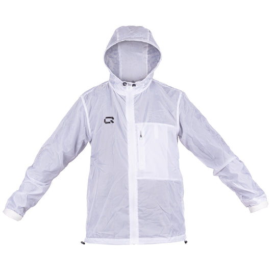 Iqon Wind Breaker White Jacket - a standard fit, eco-friendly marvel featuring a hood, minimalistic prints, and a smartwatch window