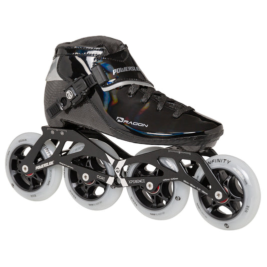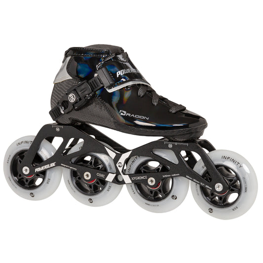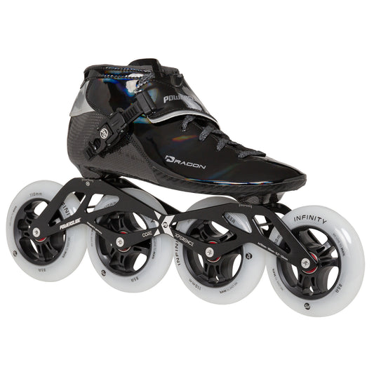 Powerslide Dragon Black 110 Racing inline skates are high-end children speed skates with a heat moldable carbon shell, 195mm mount Xperience frames & Infinity wheels.