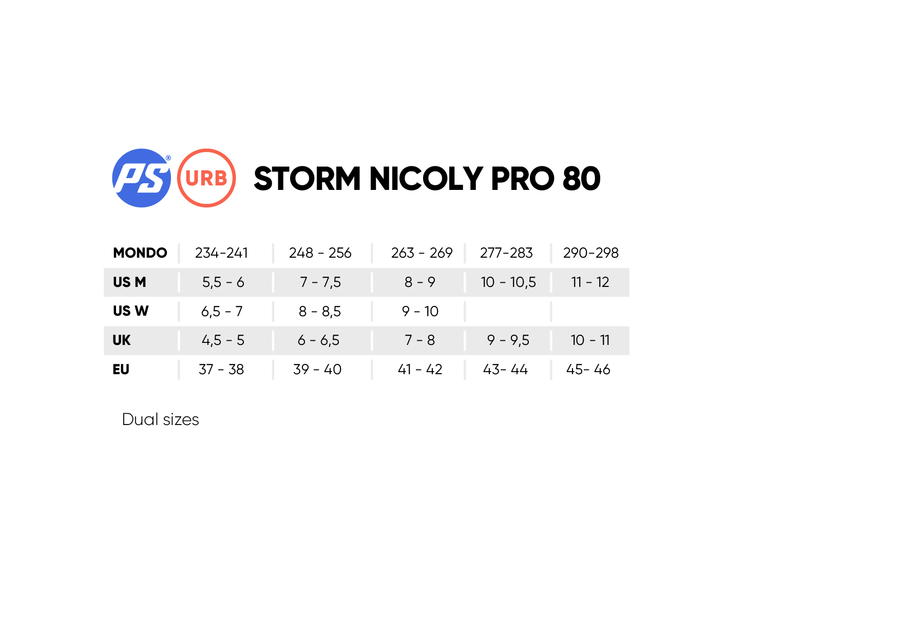 The Storm Nicoly  Pro 80 is engineered around the 165mm mounting standard and features 243mm CNC machined aluminum frames on fast and grippy 80mm wheels and smooth  WICKED ABEC 9 bearings making it the ideal setup to explore your city. If you’re looking for a superb rolling experience, look no further than the Storm Nicoly Pro 80 from Powerslide.