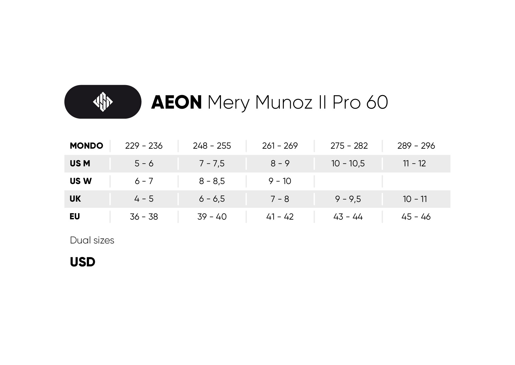 USD Aeon Mery Muñoz II Pro 60 - Signature skate for one of the world's best aggressive skaters. Aeon boot and frame, 60mm wheels, WICKED Abec 9 bearings.