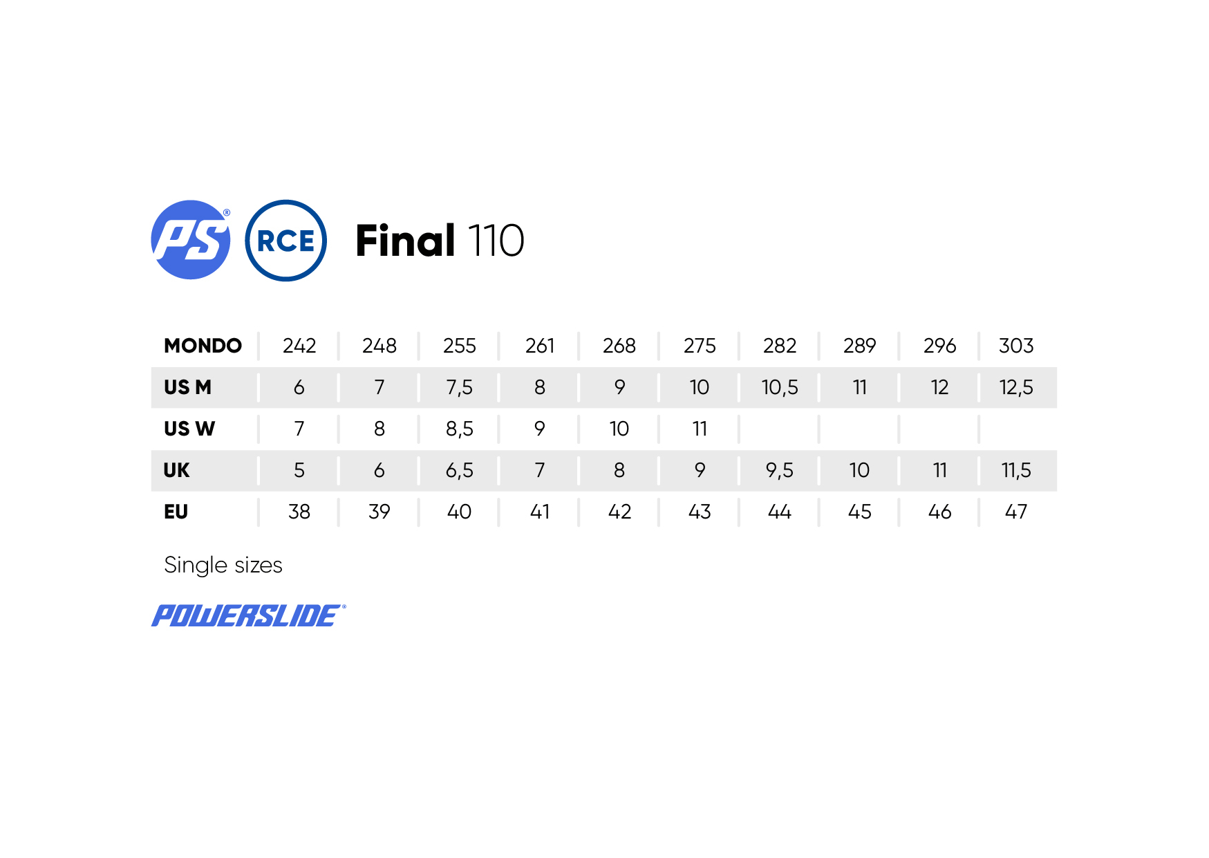 Nothing will hold you back from skating fast and improving your personal best with the affordable, high-performance POWERSLIDE Final 110 inline speedskate. Originally a high-end fitness skate, it has been re-engineered with innovative features to become a race-proven speedskate. The glass-reinforced plastic shell is both supportive and comfortable, perfect for enduring long races and marathons. This stable boot enhances responsiveness and provides excellent power transfer to the strong and precise POWERSLIDE Elite frame made of cast magnesium. The Final 110 features POWERSLIDE’s race-proven TRINITY 3-point mounting system, offering a low center of gravity and improved stability. This system also allows you to adjust the frame to suit your individual skating style. Equipped with four 110mm POWERSLIDE Infinity wheels and WICKED ABEC 9 bearings, the Final 110 is ready to deliver formidable performance. The new model features a higher cut for more lateral support and a narrower fit over the ankle for increased stability. Upgrade your skating with the POWERSLIDE Final 110 and achieve new personal bests with ease.