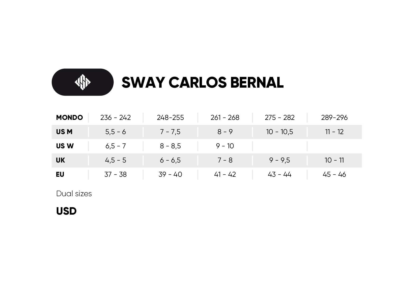 Carlos Bernal Sway Pro Skate With a throwback colorway that will take you back to the ‘90s when USD revolutionized aggressive skating, the all-new Carlos Bernal Sway Pro skate is like nothing else on the market. What started off as an entry-level aggressive skate, the Sway has quickly become a favorite among the USD team. The Carlos Bernal Sway builds on the durable Sway boot and includes a new soulplate that gives skaters smooth, controlled slides on almost any surface. The skate comes complete with high-end features, including a 45° velcro strap, KIZER Fluid V frame, Pro USD 60mm Ultra High Rebound wheels, precision Wicked ABEC 9 bearings, and the famous MYFIT 2nd Skin liner. Style, durability, and high-end features; it’s the USD Carlos Bernal Sway Pro skate.