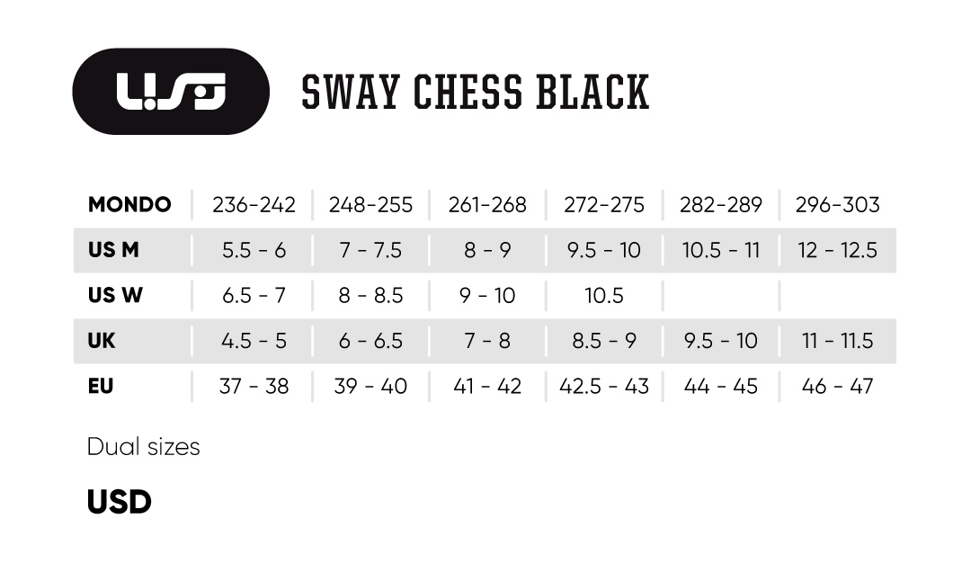 Step into the shadows with confidence. The all-new USD Sway Chess Black is a statement of power and precision, wrapped in a sleek, all-black aesthetic with some grey highlights. Built for riders who demand style, strength, and performance, this aggressive skate brings classic design and modern functionality into perfect harmony. Rugged Simplicity – The Boot and Liner The Sway Chess Black features a durable hardboot that offers unmatched support and protection while staying surprisingly light on your feet. Its smooth matte finish is minimalistic but bold, and the design is built to handle anything from stair gaps to ledge grinds. Inside, the comfortable dual fit liner hugs your foot for a snug, responsive fit. The fit overall is wide and roomy so will fit perfectly to everybody. With a dual lacing and buckle system, you get locked-in security and instant control, whether you're skating fast lines or dialling in technical tricks. Built to Roll – Setup, Frame, and More Under the hood, the Sway Chess Black comes with a solid setup: USD’s Kizer Fluid V frames, known for their incredible durability and grind-friendly design, are mounted using the reliable UFS (Universal Frame System). This means maximum compatibility with other aftermarket parts and complete customization freedom. The 58mm USD Sway 90A wheels with smooth WICKED ABEC 9 bearings offer the perfect balance between speed and control, allowing you to cruise, carve, or stomp landings with confidence. Join the Movement The USD Sway Chess Black isn’t just a skate—it’s a mindset. It’s for the skaters who carve their own path, who grind against the grain, and who don’t just ride—they rule. Lace up, lock in, and own every move. This is your board. Your city. Your game. · Matte Black Chess-Inspired Aesthetic – Sleek, all-black design with subtle chess-themed details, delivering a timeless and tactical look on and off the ledge. · Durable & Supportive Sway Boot – Built for street and park abuse, the Sway boot offers robust construction with comfortable flex and a wide soulplate for confident grinds. · Comfort-Driven USD Basic Liner – Comes equipped with a redesigned USD liner that offers enhanced padding and heel lock without sacrificing responsiveness. · Complete Kizer Fluid Frame Setup – Ready to roll with Kizer Fluid frames, USD Sway wheels, and smooth Wicked ABEC 9 bearings – ideal for fast grinds, big gaps, and daily sessions.