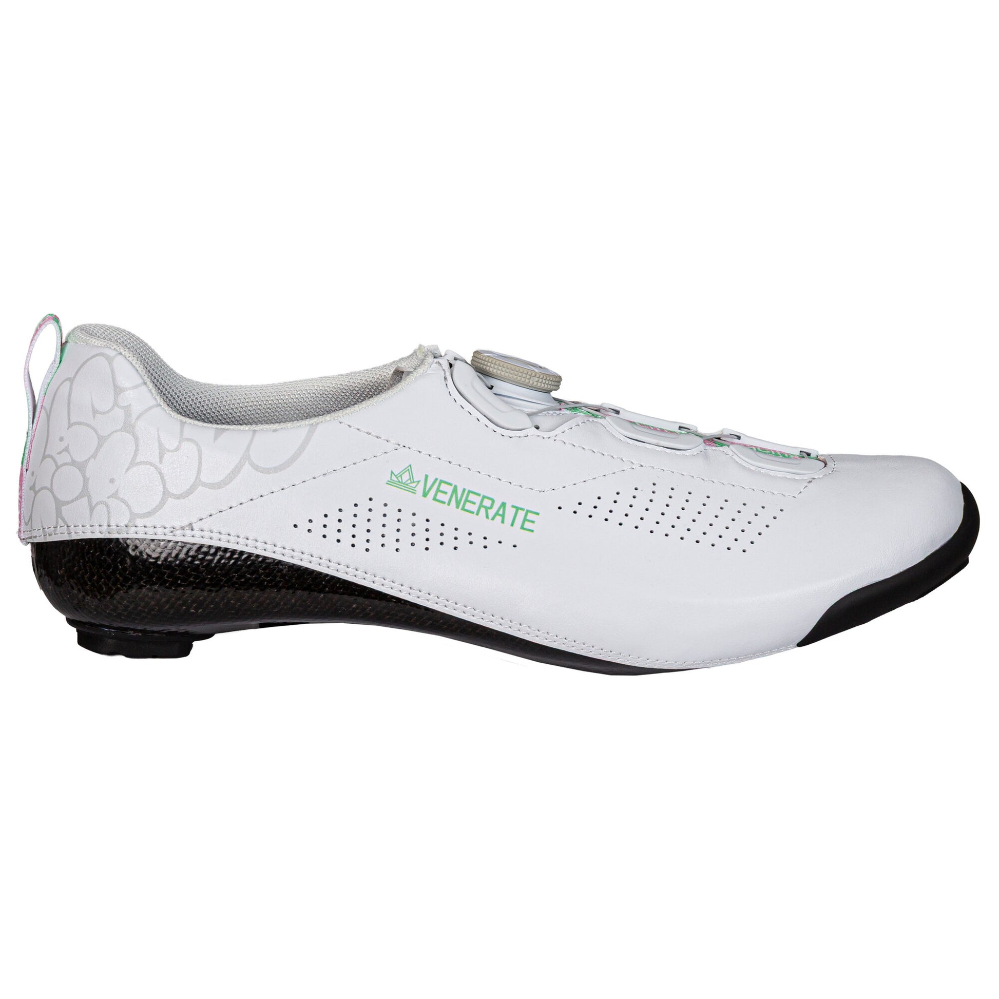 The Venerate Flow RBC is where speed meets precision and comfort meets control. Engineered for cyclists who demand more from every pedal stroke, this shoe is built to deliver power without compromise. Whether you’re chasing podiums or crushing long climbs, the Flow RBC is your edge. ________________________________________ Locked-In Comfort – The Fit That Adapts The Flow RBC features an adaptive upper crafted from lightweight, breathable materials that mold perfectly to your foot. A refined heel cup and precision lacing system ensure a snug, secure fit, eliminating hotspots and maximizing comfort over long distances. Inside, the plush yet supportive liner provides just the right balance of flex and firmness—so you stay focused on the ride, not your feet. ________________________________________ Engineered to Perform – Stiffness Meets Speed At the core of the Flow RBC is a carbon composite sole that translates every watt into forward motion. Designed with an optimized cleat platform and integrated venting, the sole delivers efficient power transfer and cool performance, even under pressure. The shoe is compatible with major clipless systems, ensuring a seamless connection between you and your bike, no matter how hard you push. ________________________________________ Flow With Purpose – Ride Beyond Limits This is more than a shoe—it’s your silent partner on every ride. The Venerate Flow RBC is built for cyclists who ride with intent, who thrive on momentum, and who never settle for average. From breakaways to big climbs, this is the shoe that flows with you—fast, fearless, and fully in sync. Your ride starts here. • 360° Carbon Shell for Maximum Power Transfer: The shoe features a full carbon shell construction, providing exceptional stiffness and support. This design ensures optimal power transfer throughout the entire pedal stroke, enhancing efficiency whether you're climbing, sprinting, or cruising. • Heat-Moldable Custom Fit: Integrated thermo sheets within the carbon layers allow for a personalized fit. By heat-molding the shoes at home, riders can eliminate pressure points and achieve a snug fit tailored to their foot shape, enhancing comfort and performance. • Dual Atop Lacing System with Kevlar Wires: The shoe employs a dual Atop lacing mechanism, utilizing lightweight dials and durable Kevlar wires. This system enables quick, single-handed adjustments during rides, ensuring a secure and customized fit. • Lightweight and Breathable Upper Materials: Constructed with a combination of soft microfiber in the heel area and breathable mesh materials elsewhere, the shoe offers a balance of comfort, ventilation, and durability. All materials used are synthetic and vegan-friendly.